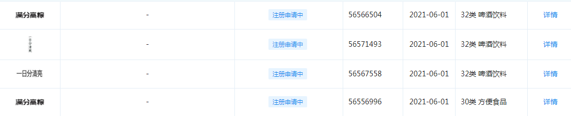 企查查显示,元气森林于6月1日提交两“满分高粽”商标注册申请,申请/注册号分别为56566504、56556996,国际分类涉及啤酒饮料、方便食品,目前商标状态为“注册申请中”。鲁网·泰山财经记者注意到,目前元气森林共有商标6417个,仅6月1日、2日提交注册商标有14个,内容包括“满分高粽”、“满分light”等。