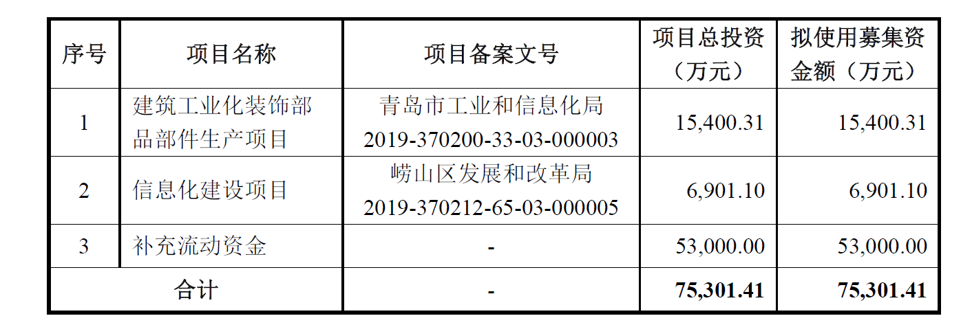 德才装饰表示,此次拟公开发行新股不超过2500万股,投入募集资金7.53亿元,其中拟使用5.3亿元补充流动资金;1.54亿用来投资于建筑工业化装饰品部件生产项目,其余用于信息化建设项目。