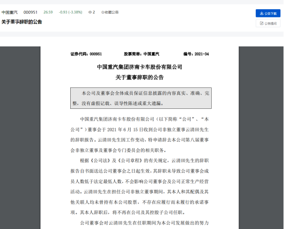 16日下午,中国重汽集团济南卡车股份有限公司(中国重汽.000951.SZ)发布公告称,董事会于本月15日收到公司非独立董事云清田的辞职报告,而且待其辞职后,将不再在中国重汽及其控股子公司任职。