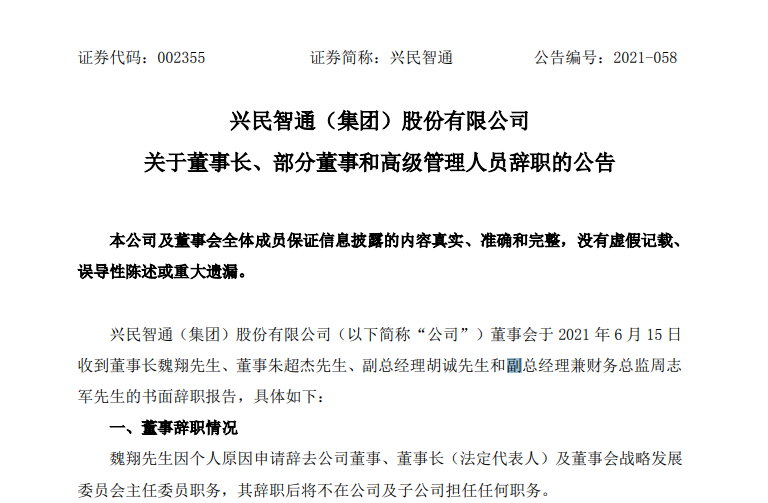 兴民智通(集团)股份有限公司(兴民智通.002355.SZ)17日发布关于董事长、部分董事和高级管理人员辞职的公告。兴民智通董事会于2021年6月15日收到董事长魏翔、董事朱超杰、副总经理胡诚和副总经理兼财务总监周志军的书面辞职报告。