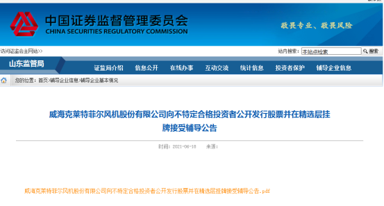 18日,中国证券监督委员会山东监管局更新企业辅导信息。鲁网·泰山财经记者注意到威海克莱特菲尔风机股份有限公司(克莱特.831689.OC)已备案辅导拟冲刺精选层。