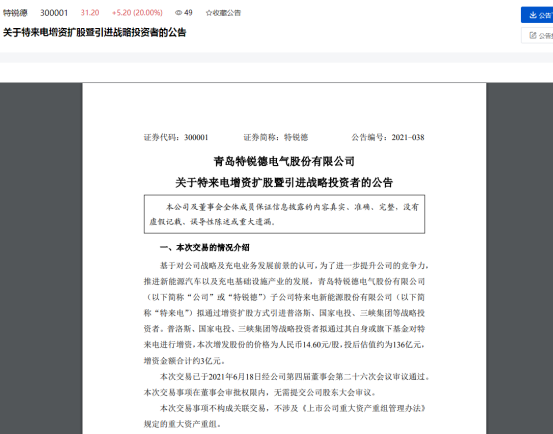 据公告显示,本次共有10位战略投资者拟通过其自身或旗下基金对特来电进行增资,本次增发股份的价格为人民币14.60元/股,投后估值约为136亿元,增资金额合计约3亿元。
