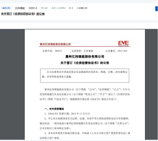 2014年11月6日,亿纬锂能曾与青岛特锐德汽车充电有限公司(特来电曾用名)签订了《合资经营协议书》,双方共同出资成立“惠州亿纬特锐德汽车充电有限公司”。合资公司的注册资本为人民币1亿元,青岛特锐德以现金出资5100万元整,占合资公司51%的股份;亿纬锂能以自有资金出资4900万元整,占合资公司49%的股份。