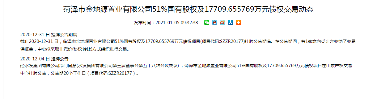 据悉,去年12月,水发天源集团曾以2.43亿元底价,转让该企业51%股权及1.77亿债权,今年1月,山东产权交易中心公告称,该项目已有1家意向受让方交纳了交易保证金,中心拟采取非竞价(协议转让)方式组织进行交易。但鲁网·泰山财经记者注意到,目前金地源置业股权并未变更。