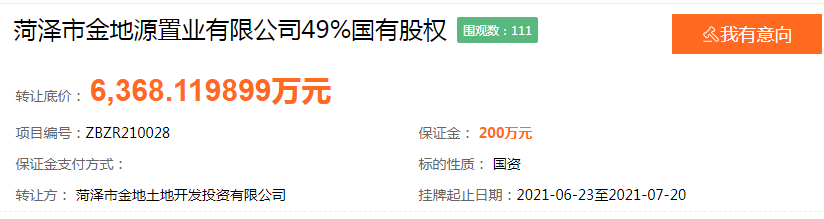 时隔半年,菏泽市金地源置业有限公司(简称“金地源置业”)再度被披露股权转让信息。23日,菏泽市国资委全资企业菏泽市金地土地开发投资有限公司(简称“金地土地开发投资公司”)发布公告称,拟以6368.12万元底价转让菏泽市金地源置业有限公司(简称“金地源置业”)49%股权。