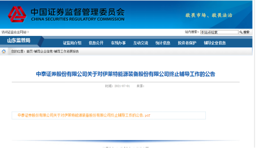 近日,鲁网·泰山财经记者从中国证券监督管理委员会山东监管局官网(以下简称“山东监管局”)获悉,中泰证券股份有限公司(以下简称“中泰证券”)发布了关于对伊莱特能源装备股份有限公司(以下简称“伊莱特”)终止辅导工作的公告。