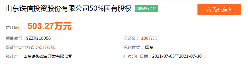 近日,鲁网·泰山财经记者从山东产权交易中心获悉,山东铁路综合开发有限公司(简称“山东铁路综合开发公司”)拟转让山东铁信投资股份有限公司(简称“山东铁信投资公司”)50%股权,底价为503.27万元,挂牌期限截止7月30日。据悉,山东铁信投资公司曾参与平度铁投·中信智慧新城项目,计划总投资400亿元。