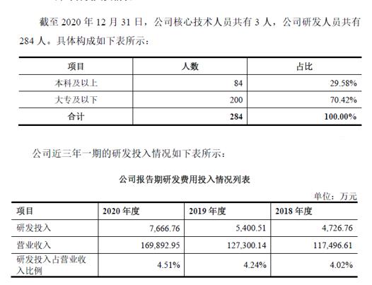鲁网·泰山财经记者梳理发现,“研发”在英科再生招股书中频频提及,目前,英科再生拥有10项国家授权发明专利,2个项目被认定为国家火炬计划产业化示范项目。截至去年12月底,英科再生核心技术人员共3人,研发人员共284人,占比10.24%,其中,本科及以上学历人员共84人,占比29.58%。近3年,其研发投入分别为4726.76万元、5400.51万元、7666.76万元,占营收分别为4.02%、4.24%、4.51%。