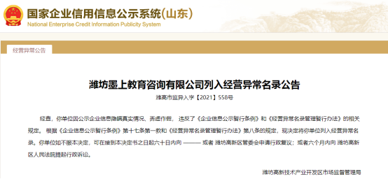 今日,国家企业信用信息公示系统(山东)官网更新企业经营异常名录,鲁网·泰山财经记者注意到潍坊墨上教育咨询有限公司(以下简称“墨上教育咨询”)被列入企业经营异常名录。