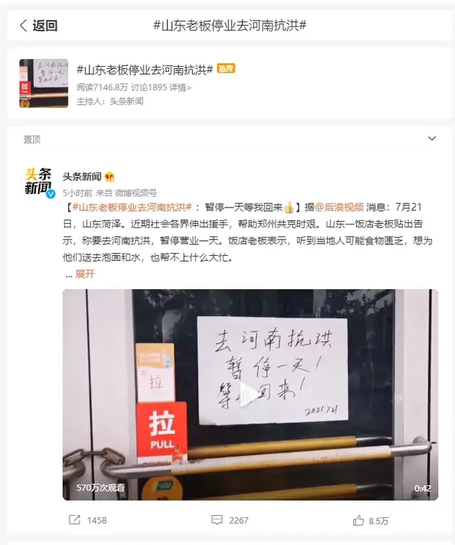 7月21日,菏泽一饭店老板贴出告示称“去河南抗洪,暂停一天,等我回来!”的短视频在网上引起广大网友叫好,纷纷为菏泽小伙点赞!7月22日下午,鲁网记者电话采访了菏泽这家饭店的老板张龙,据悉,张龙已经从郑州救援后到达了救援第二站新乡,他表示,饭店可能要多停业几天了!