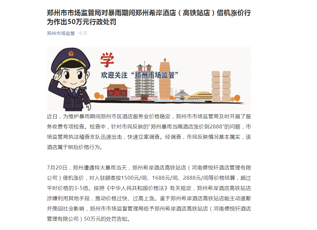今日,郑州市市监局发布公告称,7月20日,郑州遭遇特大暴雨当天,郑州希岸酒店高铁站店(河南德悦轩酒店管理有限公司)借机涨价,对入驻顾客按1500元/间、1688元/间、2888元/间等价格结算,超过平时价格的3倍-5倍。