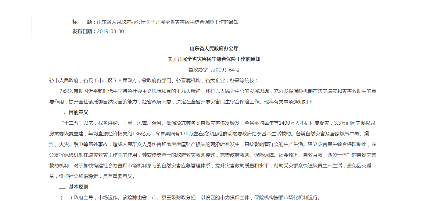 2019年3月,山东省人民政府办公厅曾披露,山东省灾害民生综合保险是根据山东省委、省政府决策部署,保费由财政全额保障,为全省人民在自然灾害和特定意外事故中遭受的损失,提供保险保障的一项普惠、利民的保险,也是我省在全国首创的一件民生工程。