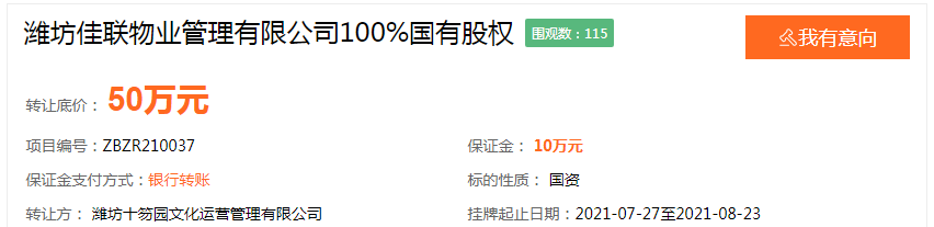 27日,潍坊市投资集团有限公司(简称“潍坊投资集团”)旗下潍坊十笏园文化运营管理有限公司(简称“十笏园文化”)发布公告,拟以50万元底价,转让潍坊佳联物业管理有限公司(简称“佳联物业”)100%股权,挂牌期截至8月23日。据了解,佳联物业曾在2019、2020年连续两年中标潍坊市美术馆物业管理项目。