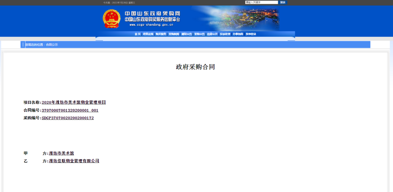 鲁网·泰山财经记者在中国山东政府采购网、潍坊市政府采购中心注意到,佳联物业曾在2019、2020年连续两年中标潍坊市美术馆物业管理项目,服务内容涵盖房屋共用部位的日常维护和管理、环境卫生、公共秩序维护等方面,两年中标金额总计43.82万元。