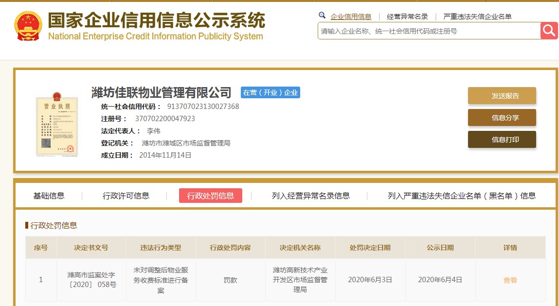 另据国家企业信用信息公示系统显示,去年6月,佳联物业曾因“未对调整后物业服务收费标准进行备案”,被潍坊高新技术产业开发区市场监督管理局作出行政处罚。