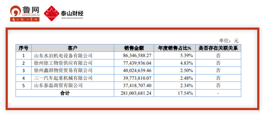 鲁网·泰山财经记者注意到,2020年索力得主要客户共5家,其中包括徐工集团旗下徐州徐工物资供应有限公司(简称“徐工供应”)、三一重工旗下三一汽车起重机械有限公司,以及山东水泊机电设备有限公司、徐州鑫湃物资贸易有限公司和山东泰磊商贸有限公司三家民企。5大客户销售总额2.81亿元,年度销售占比17.54%。