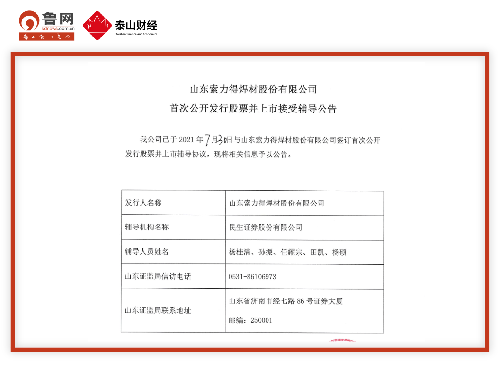 据了解,目前索力得已进入首次公开发行股票并上市的辅导阶段,辅导机构为民生证券,未来公司若向证监会或有权审核机构提交首次公开发行股票并上市的申请材料并获受理,公司将向全国中小企业股份转让系统申请股票停牌。鲁网·泰山财经记者 吴奕萱