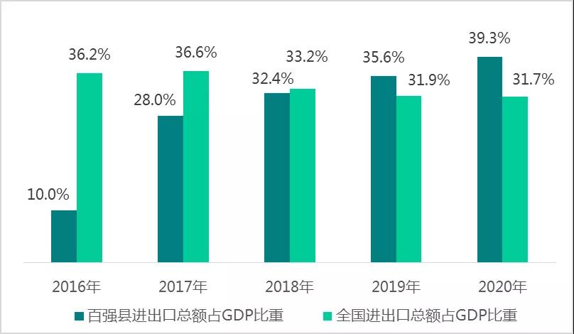 出口层面,整体来看,百强县的对外贸易依存度逐年上升,但近年来增速开始放缓,加之新冠肺炎疫情影响,百强县之间对外开放程度存在较大差异,例如湖北省仙桃市因全球防疫物资需求激增,2020年外贸进出口总额同比增长超过200%,但有更多的县或县级市对外贸易因受到疫情冲击而大幅降低。2016-2020年百强县进出口总额占GDP比重变化
