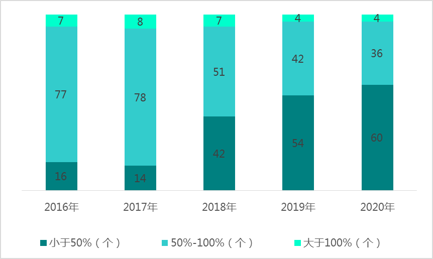 传统动能推动力逐渐减弱,县域实现高质量发展需要引入新动能榜单数据显示,传统动能对县域经济的推动力逐渐减弱,县域实现高质量发展也需要引入新动能。通过比较百强县2016-2020年的统计数据发现,近年来,投资、消费、出口传统的三驾马车对县域经济的影响发生了变化。投资层面,百强县固定资产投资占GDP比重小于50%的地区数量整体呈增长态势,这说明百强县固定资产投资对经济增长的贡献度逐步降低。2016-2020年百强县固定资产投资占GDP比重数量分布