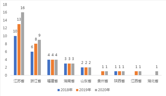 数据来源:2020年相关县域统计公报,赛迪顾问整理,2021.08从“千亿县”省份分布看,共分布于全国9个省份。分别是江苏省16个、浙江省9个、福建省4个、湖南省3个、山东省2个、陕西省1个、河北省1个、贵州省1个、江西省1个。