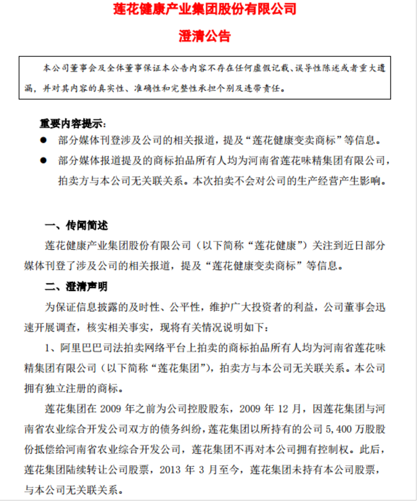虽然此次起拍价不足品牌价值的百分之一,但拍卖却“遇冷”,都说市场是没有记忆的,但A股上市公司莲花健康产业集团股份有限公司(以下简称“莲花健康”)却急了,尽管紧急出面辟谣: 莲花商标所有人为公司前股东,拍卖与公司无关联。但在网上搜索“莲花健康”,负面消息却有一大波: