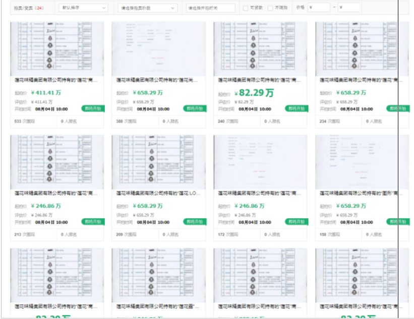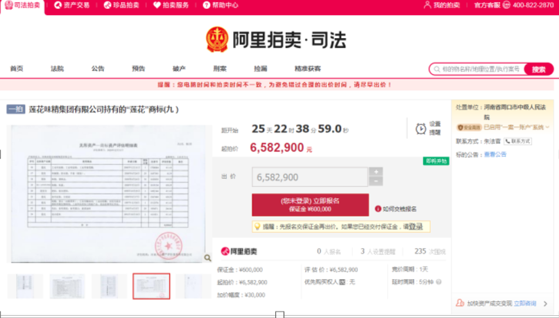 据拍卖信息显示,这24起拍卖的拍品所有人均为河南省莲花味精集团有限公司(下称“莲花味精集团”),拍卖将由河南省周口市中级人民法院执行,时间为8月4日10时至8月5日10时。