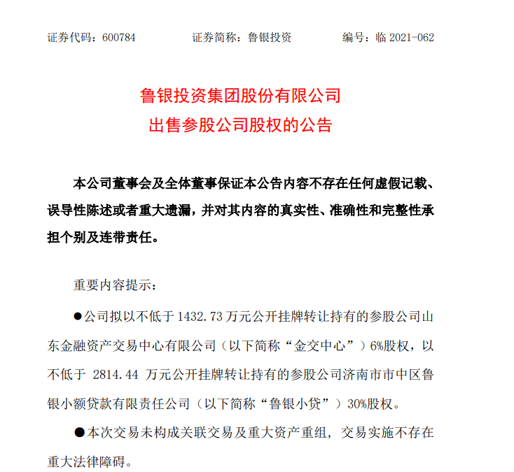 10日,鲁银投资集团股份有限公司(鲁银投资. 600784.SH)公告称,为进一步聚焦主营业务,拟以不低于1432.73万元挂牌价转让所持山东金融资产交易中心有限公司(简称“山东金交中心”)6%股权,以不低于2814.44万元挂牌价转让所持济南市市中区鲁银小额贷款有限责任公司(简称“鲁银小贷”)30%股权,合计转让价不低于4247.17万元。