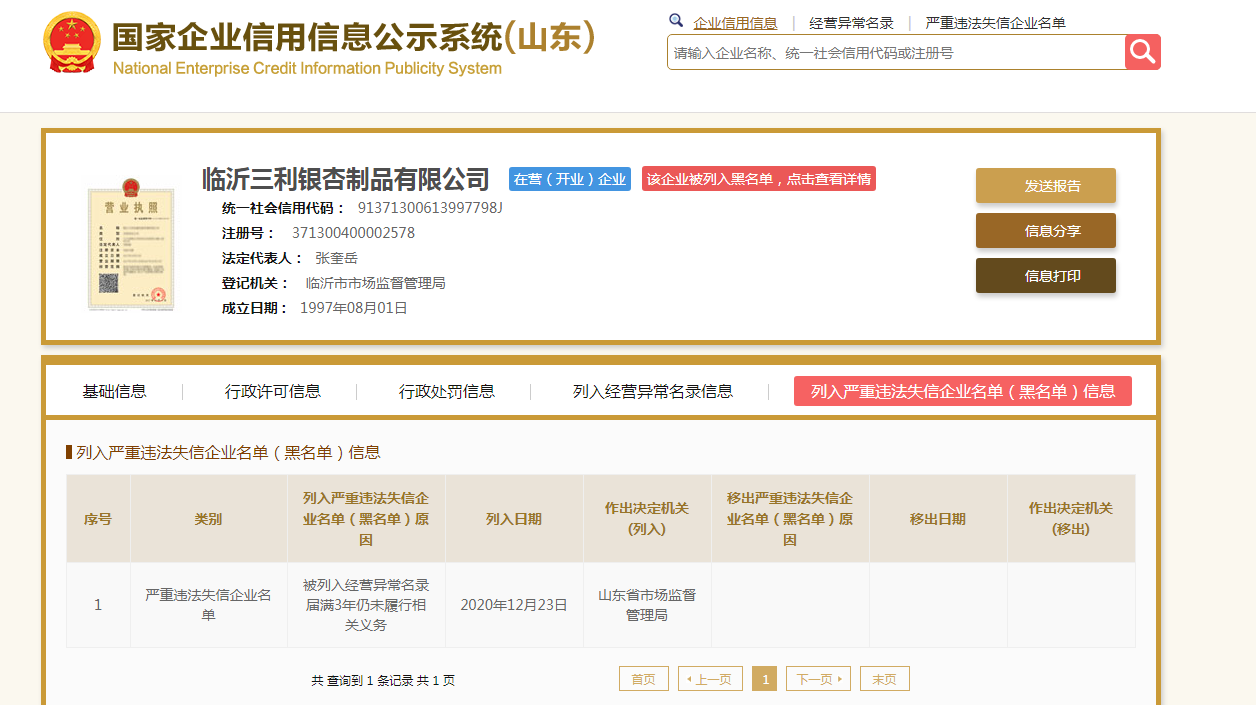 国家企业信用信息公示系统(山东)信息显示,临沂三利银杏制品曾于2017年12月21日因“失联”被临沂市市场监督管理局列入企业经营异常名录,3年后,由于该企业仍未履行公示义务,山东省市监局以“被列入经营异常名录届满3年仍未履行相关义务”为由,将其被列入严重违法失信企业“黑名单”。