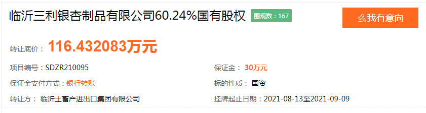 今日,鲁网·泰山财经记者从山东产权交易中心获悉,临沂市国有资产投资控股集团有限公司(简称“临沂国控集团”)旗下临沂土畜产进出口集团有限公司(简称“临沂土畜产进出口集团”)拟以116.43万元底价,转让所持临沂三利银杏制品有限公司(简称“临沂三利银杏制品”)60.24%股权,挂牌期截至9月9日。鲁网·泰山财经记者注意到,该企业系中日合资企业,去年年底因“失联”满3年,被山东省市场监督管理局(简称“省市监局”)列入严重违法失信“黑名单”。