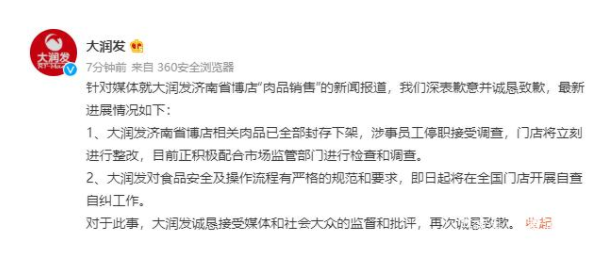 据大润发微博消息,针对媒体就大润发济南省博店“肉品销售”的新闻报道,我们深表歉意并诚恳致歉,最新进展情况如下: