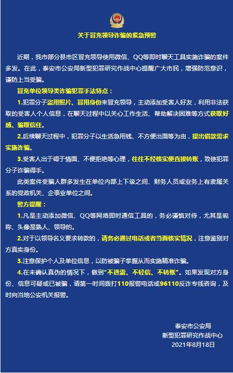 泰安警方发布关于冒充领导诈骗的紧急预警