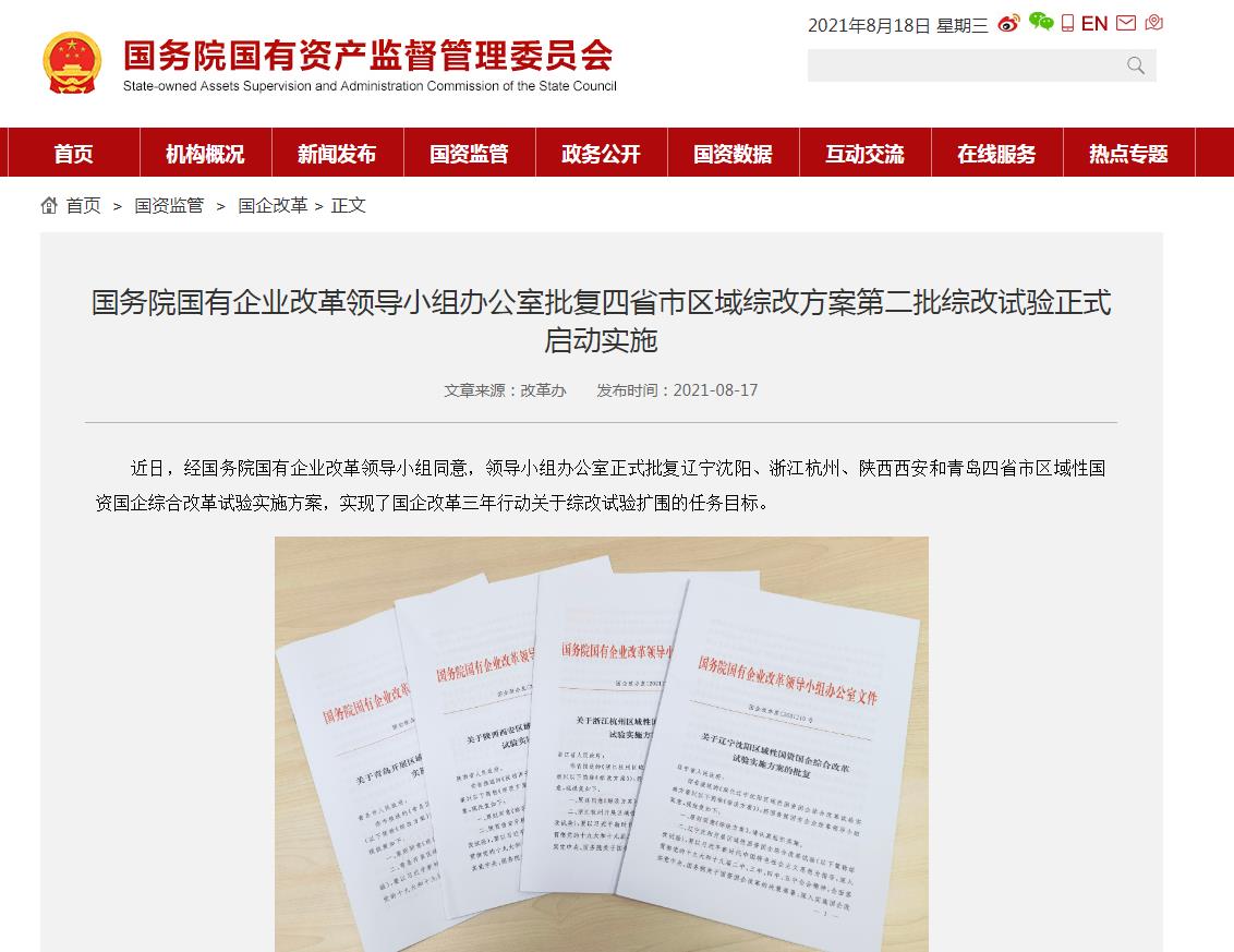 公告指出,近日,经国务院国有企业改革领导小组同意,领导小组办公室正式批复辽宁沈阳、浙江杭州、陕西西安和青岛四地区域性国资国企综合改革试验实施方案,这意味着第二批综改试验正式启动实施,表明在国企改革三年行动积极实施背景下,区域性国资国企综合改革试验实现了多点开花。