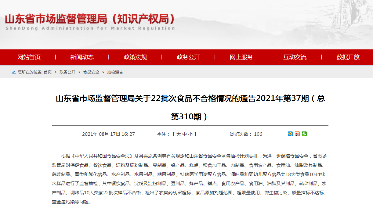 17日,山东省市场监督管理局发布关于22批次食品不合格情况的通告。22批次食品不合格情况中,有11批次食品存在食品添加剂超范围、超限量使用问题。
