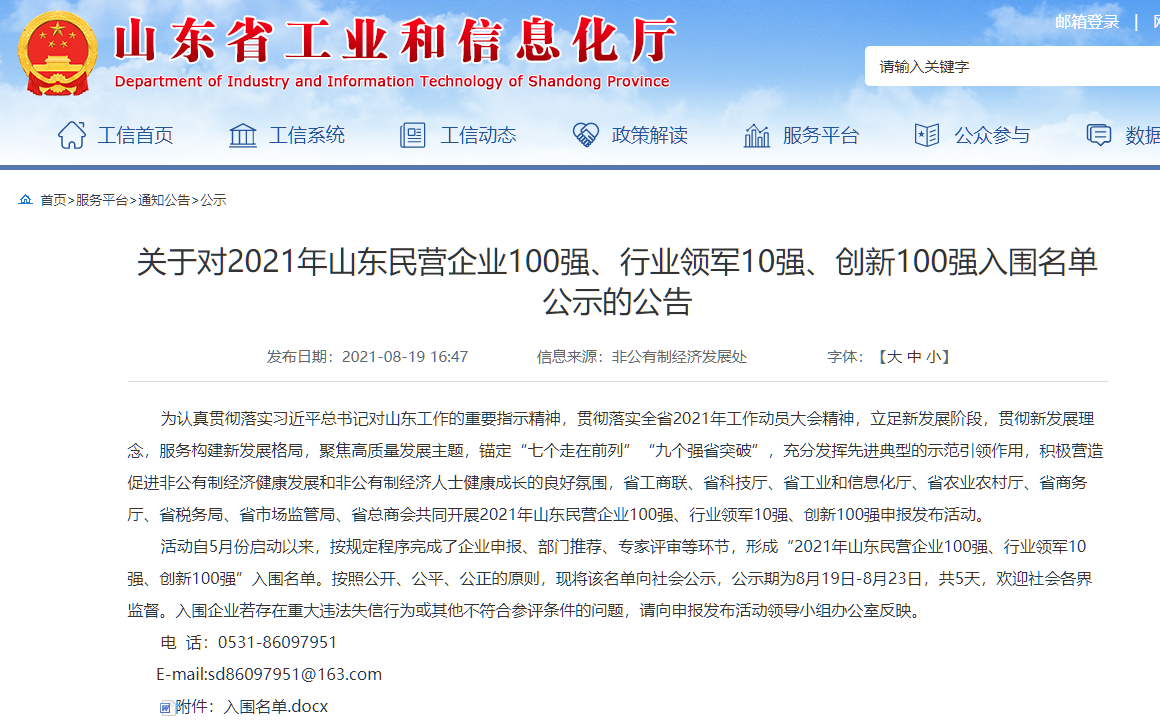 19日,山东省工信厅发布了关于对2021年山东民营企业100强、行业领军10强、创新100强入围名单公示的公告。