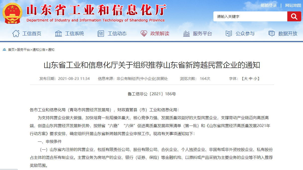 23日,山东省工业与信息化厅发布了关于组织推荐山东省新跨越民营企业的通知,通知显示,为支持民营企业做大做强,山东将组织开展山东省新跨越民营企业申报工作,相关企业最高可获得一次性奖励500万元。