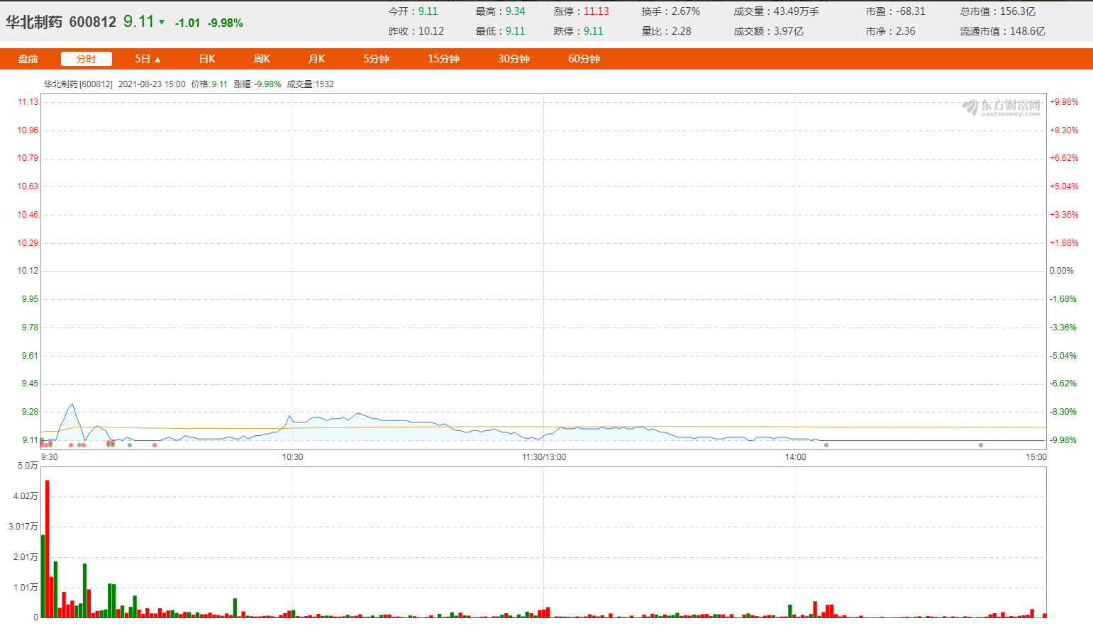 受集采断供山东、被国家药品集采开出首张“断供罚单”影响,华北制药股份有限公司(华北制药.600812.SH)今日开盘跌停,之后随有所反弹,但截至收盘封于跌停,报收9.11元/股,总市值为156.3亿元。