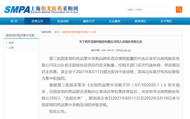 根据公告,华北制药在山东省未能按协议供应约定采购量,经相关部门多次约谈协商,供应情况仍未改善。该企业于2021年8月11日提出放弃中选资格,造成山东医疗机构反映较为集中和强烈。根据第三批国家集采《全国药品集中采购文件(GY-YD2020-1)》有关规定,经国家组织药品联合采购办公室成员单位集体审议后,决定将华北制药股份有限公司列入“违规名单”,取消该企业自2021年8月11日至2022年5月10日参与国家组织药品集中采购活动的申报资格。
