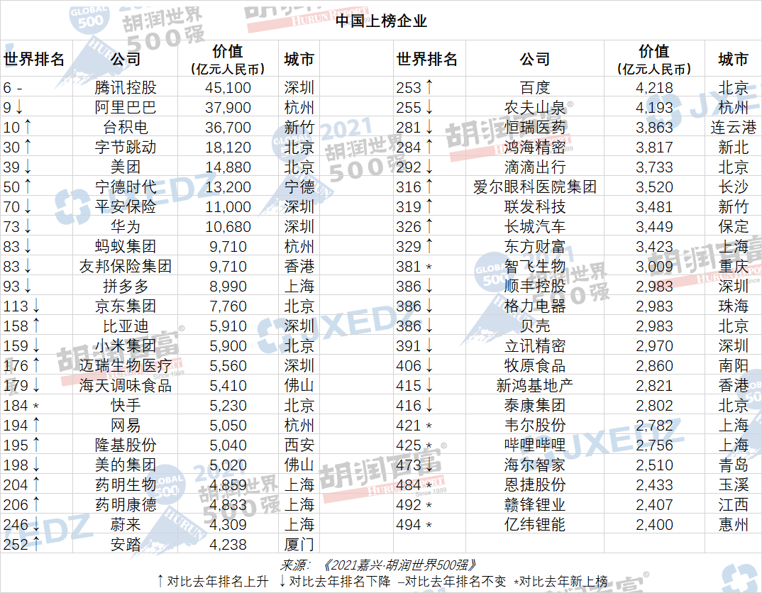 8月20日,胡润研究院携手嘉兴市人民政府、嘉兴经济技术开发区联合发布《2021嘉兴·胡润世界500强》,列出了世界500强非国有企业,按照企业市值或估值进行排名。上市公司市值按照2021年7月15日的收盘价计算,非上市公司估值参考同行业上市公司或者根据最新一轮融资情况进行估算。本次500强中,中国47家企业上榜。其中山东省仅青岛的海尔智家入选,以价值2510亿元位列473位。