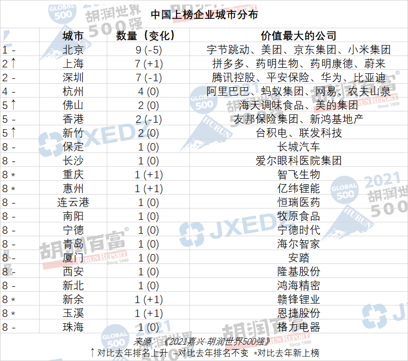 47家企业中,31家企业价值比去年增长,包括7家新上榜企业。16家企业价值比去年下降或保持不变。11家企业落榜。这47家企业分布在21个城市,北京以9家居首,其次是上海和深圳,分别有7家。中国上榜企业总价值36万亿元。