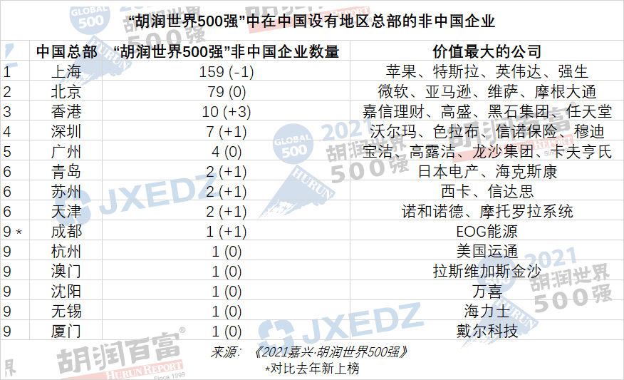 鲁网·泰山财经记者注意到,胡润世界500强上的非中国企业中,有271家公司在14个中国城市设有地区总部,绝大多数在上海(159家)和北京(79家),其中有两家在青岛设有地区总部,分别是日本电产和海克斯康。