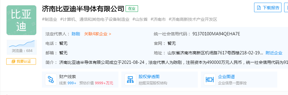 鲁网·泰山财经记者于企查查获悉,8月24日,济南比亚迪半导体有限公司成立,法定代表人为陈刚,注册资本为49亿元人民币,大股东为比亚迪半导体股份有限公司,持股比例77.75%。