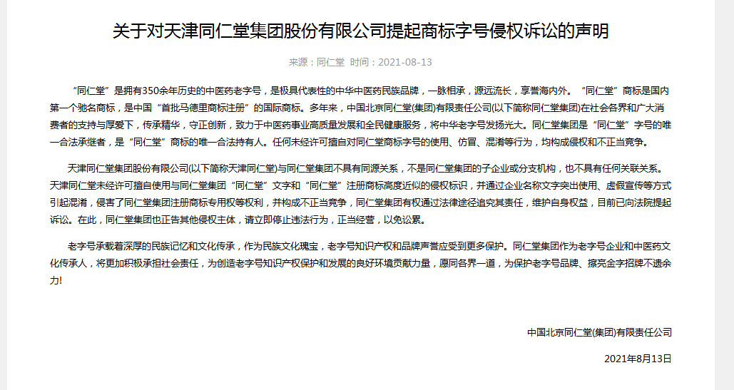 25日,针对北京同仁堂对天津同仁堂集团股份有限公司(以下简称“天津同仁堂”)提起商标字号侵权诉讼一事,天津同仁堂发布声明称,天津同仁堂的前身可追溯至清朝时期,其企业名称、字号和商标等均系合法取得,具有悠久的历史渊源,毋庸置疑。