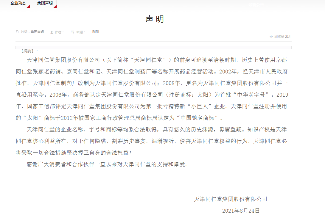 25日,天津同仁堂对此事发布声明:天津同仁堂的前身可追溯至清朝时期,历史上曾使用京都同仁堂张家老药铺、京同仁堂和记、天津同仁堂制药厂等名称开展药品经营活动。2002年,经天津市人民政府批准,天津同仁堂制药厂改制为天津同仁堂股份有限公司;2008年,更名为天津同仁堂集团股份有限公司并一直沿用至今。2006年,商务部认定天津同仁堂股份有限公司(注册商标:太阳)为首批“中华老字号”。2019年,国家工信部评定天津同仁堂集团股份有限公司为第一批专精特新“小巨人”企业。天津同仁堂注册并使用的“太阳”商标于2012年被国家工商行政管理总局商标局认定为“中国驰名商标”。