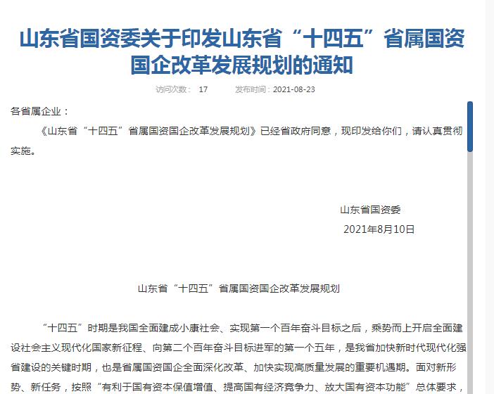 近日,山东省国资委披露《山东省“十四五”省属国资国企改革发展规划》,山东省属国企力争到2025年,主要经营指标排名保持在全国省级监管企业最前列,期末资产总额达到60000亿元,实现营业收入30000亿元;实现利润总额1500亿元、归母净利润300亿元。此外,“十四五”期间,力争打造5家左右具有国际竞争力的世界一流企业、15家左右具有市场主导权的行业一流企业,培育100家左右“专精特新”和“单项冠军”企业。