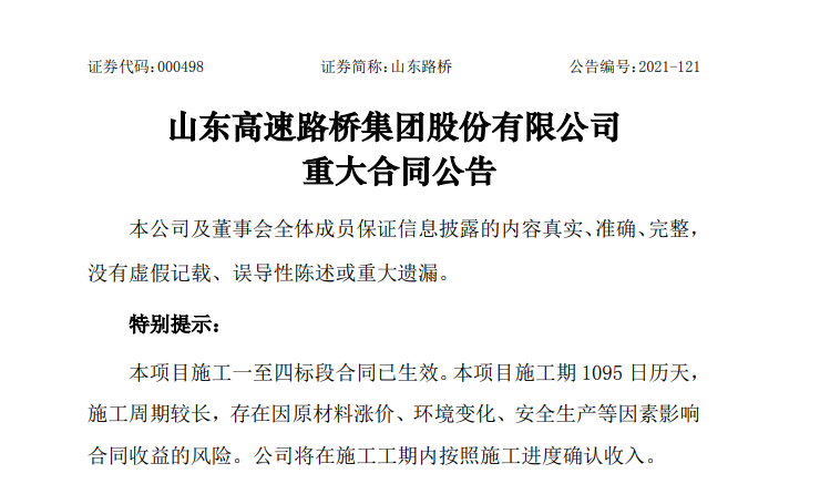 山东高速路桥集团股份有限公司(山东路桥.000498.SZ)3日午间发布重大合同公告。