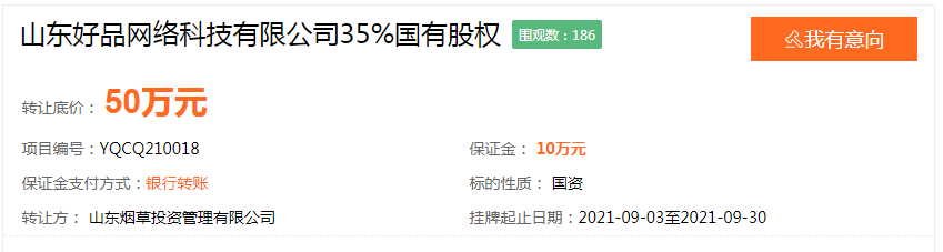 近日,山东产权交易中心披露,中国烟草总公司山东省公司(简称“中烟山东”)旗下山东烟草投资管理有限公司,拟以50万元底价。转让所持山东好品网络科技有限公司(简称“好品科技”) 35%股权,挂牌期截至9月30日。