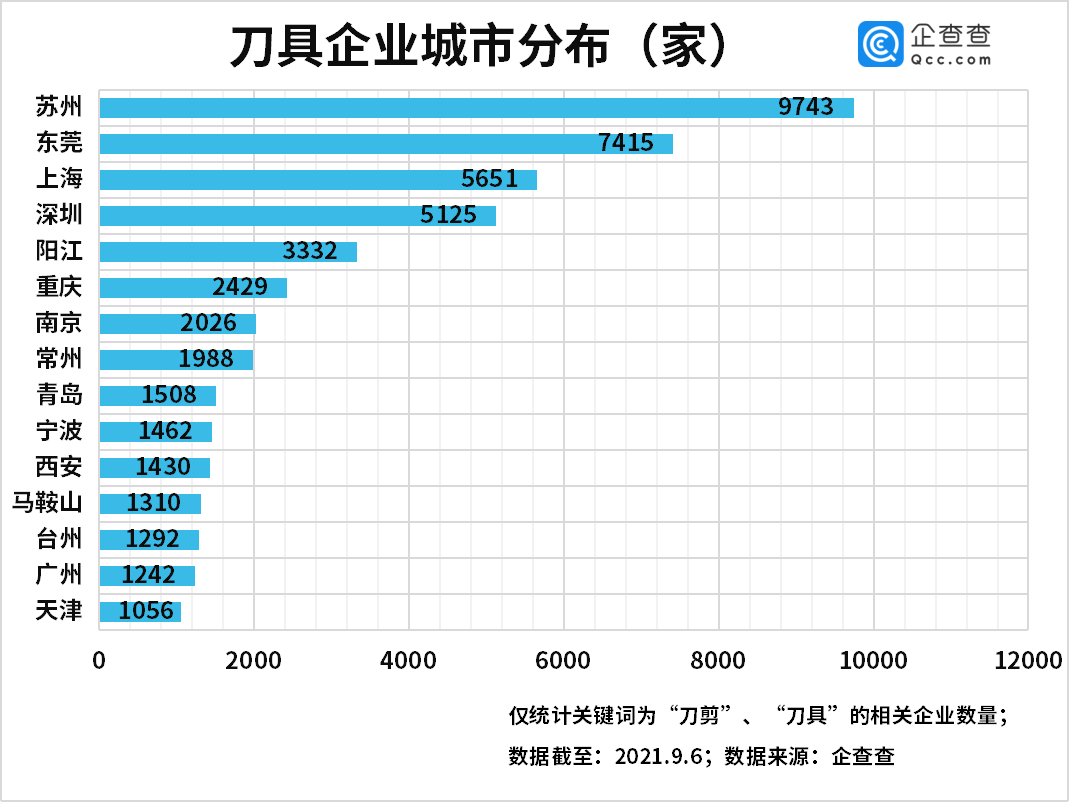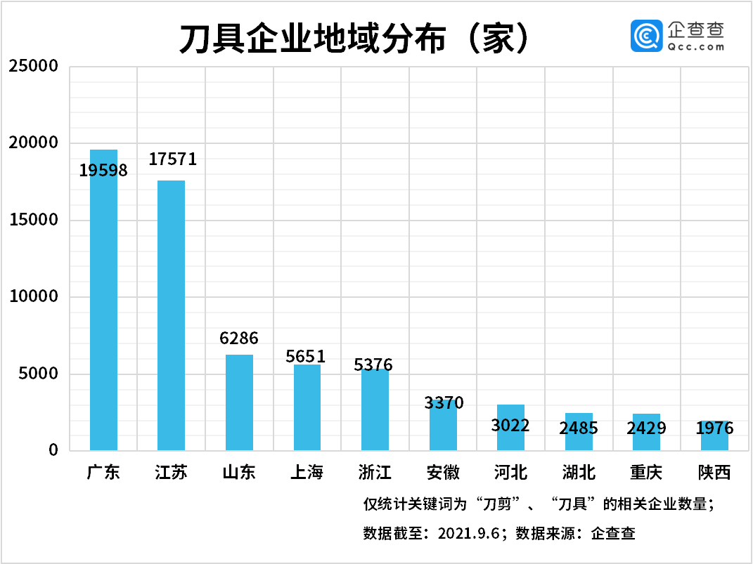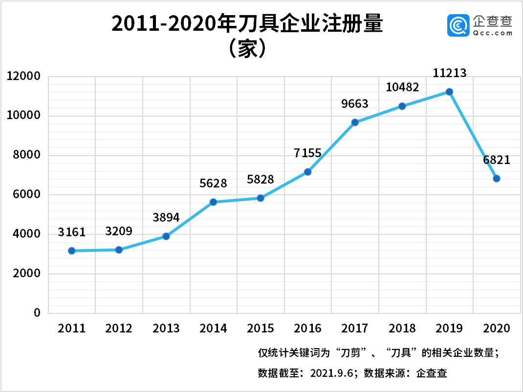 另,鲁网·泰山财经记者从企查查APP上了解到,我国共有关键词为“刀具”和“刀剪”的现存企业8.41万家。2019年的注册量达到了十年来的最高点,共计1.12万家,同比增长7%。2020年的注册量有所减少,仅6821家,同比减少39%。