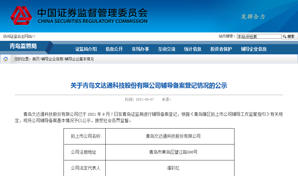 据中国证券监督管理委员会青岛监管局消息,青岛文达通科技股份有限公司(以下简称“文达通”)已于2021年9月7日在青岛证监局进行辅导备案登记,辅导机构为金元证券股份有限公司。