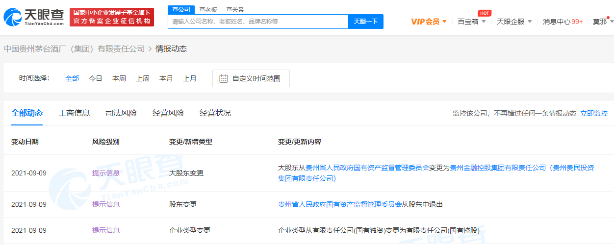 鲁网·泰山财经记者从天眼查客户端获悉,贵州省人民政府国有资产监督管理委员会从中国贵州茅台酒厂(集团)有限责任公司(以下简称“茅台集团”)股东中退出,大股东从贵州省人民政府国有资产监督管理委员会变更为贵州金融控股集团有限责任公司(贵州贵民投资集团有限责任公司),茅台集团企业类型也发生变更,从有限责任公司(国有独资)变更为有限责任公司(国有控股)。