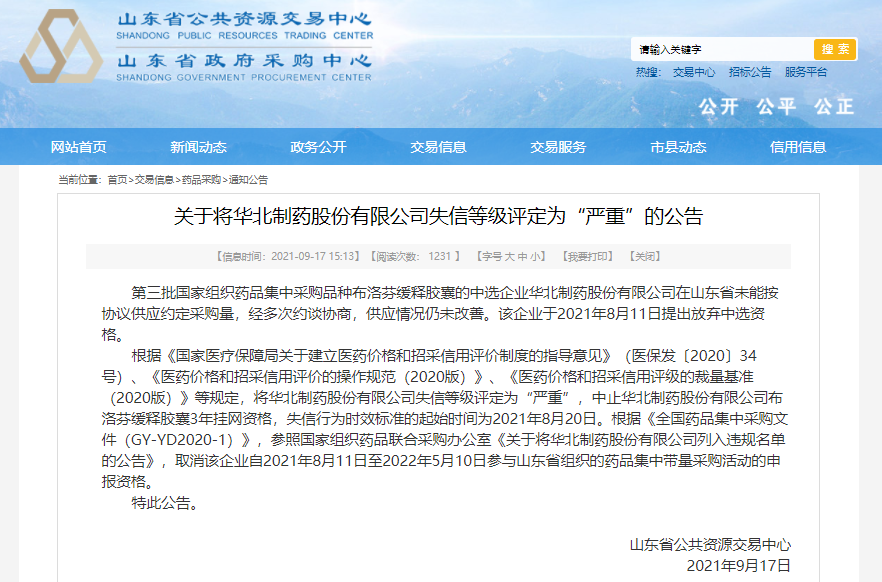 山东省公共资源交易中心17日发布公告表示,华北制药断供布洛芬缓释胶囊,多次协商仍未改善,根据相关规定,将华北制药的失信等级评定为“严重”, 中止华北制药布洛芬缓释胶囊3年挂网资格,同时取消该企业自2021年8月11日至2022年5月10日参与山东省组织的药品集中带量采购活动的申报资格。
